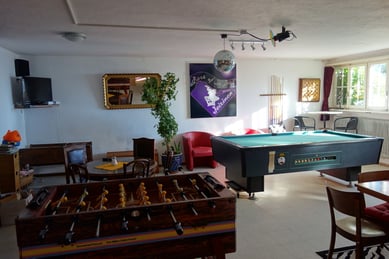 A pool table, a chess board as well as a tabletop football invite to play.